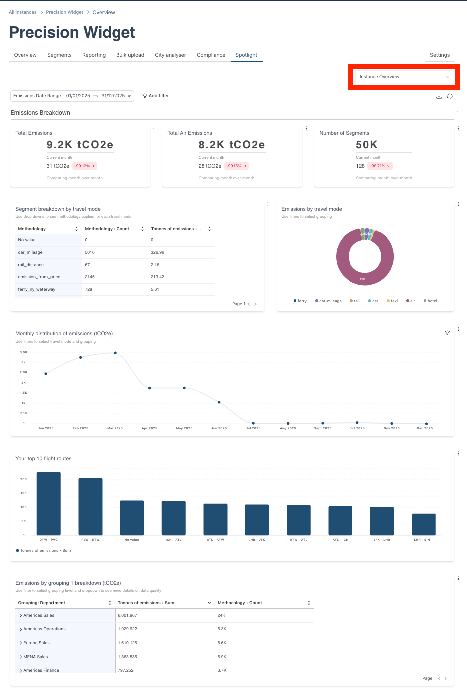 Once you have clicked into the Spotlight tool you will see the Instance Overview dashboard. Depending on your subscription you may have access to additional dashboards as Thrust Carbon releases new insights.