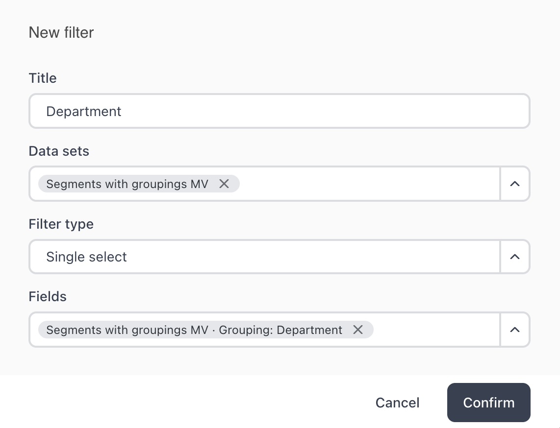 For this example we are going to add a new filter for “Department”, a grouping type that is attached to the uploaded segments in this instance.