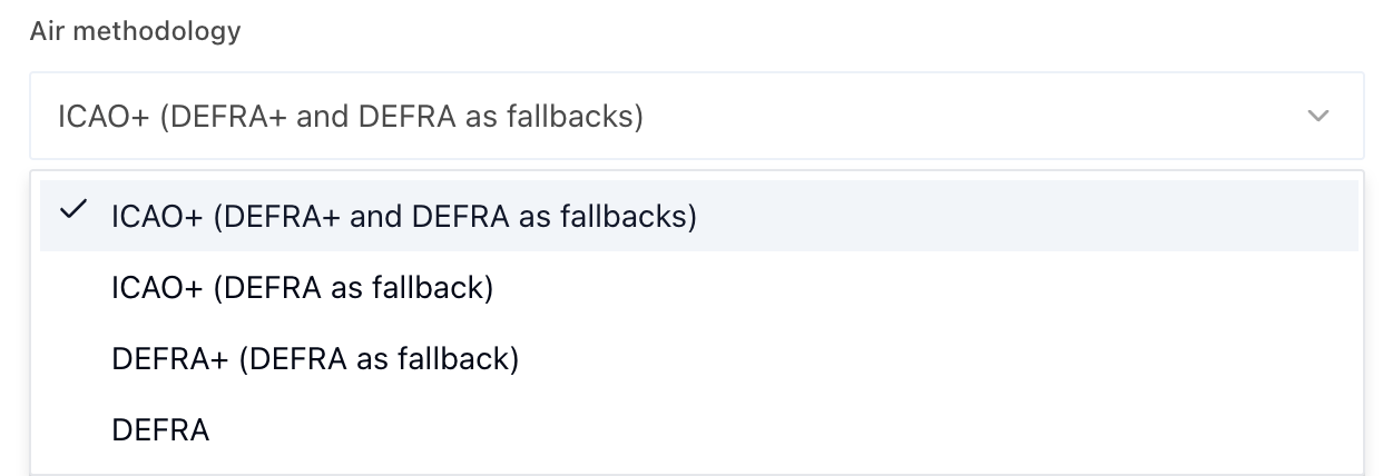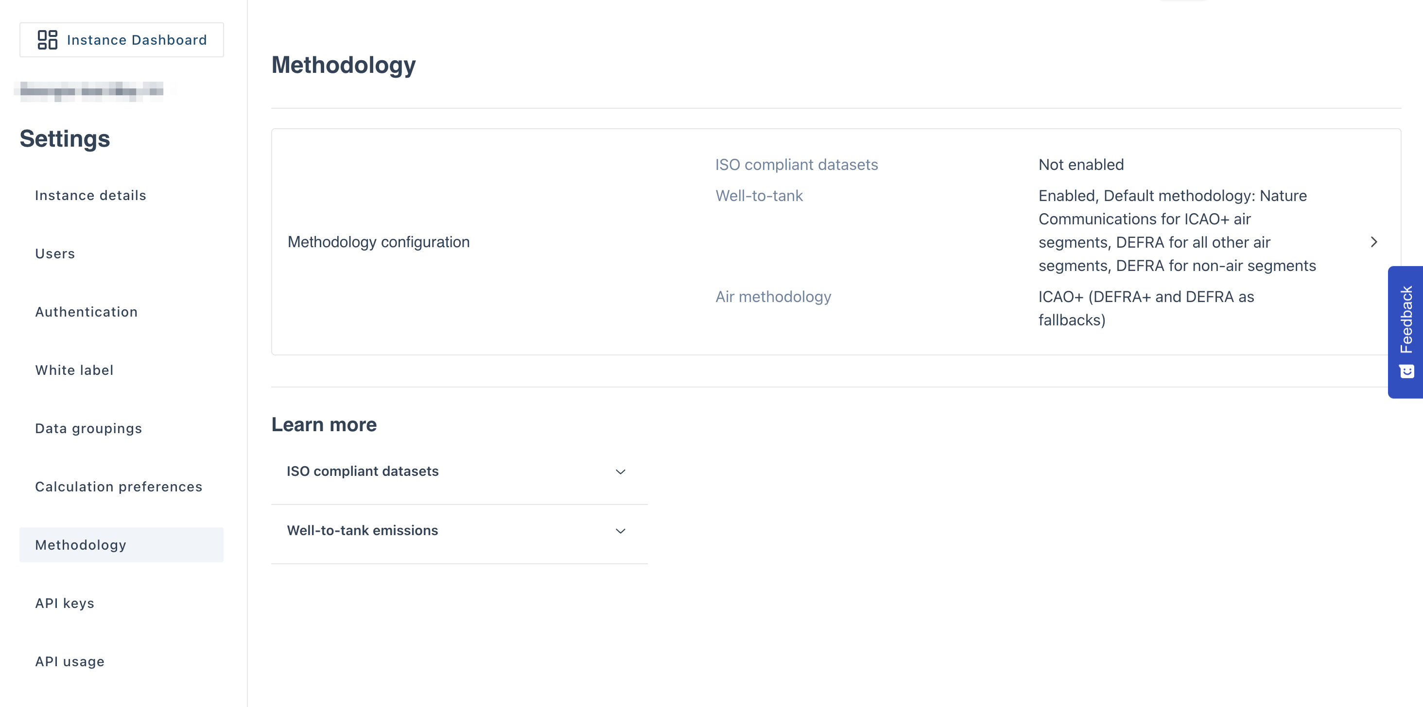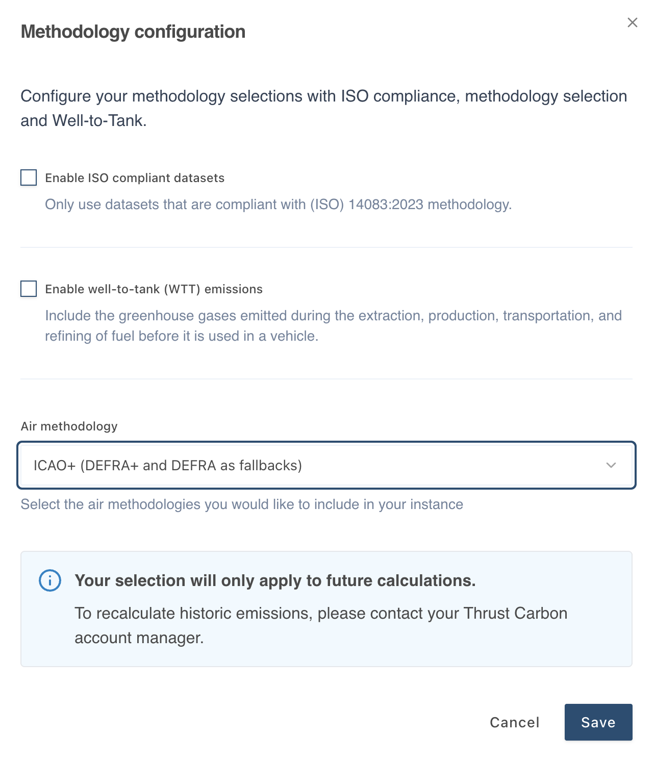 Here you are able to choose if your instance is ISO 14083 compliant, the well-to-tank settings and which air methodologies are to be used. Click on the "Methodology configuration" box to view the options available, the below pop-out will appear: