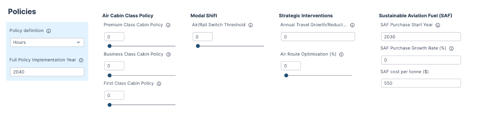 The decarbonisation levers in the ‘Policies’ section (with the exception of the SAF levers) are applied 100% by the year of full implementation (this year can be chosen by the user), under the assumption that a policy changes all travel behaviour. E.g. mandatory use of economy for all flights under 3 hours.