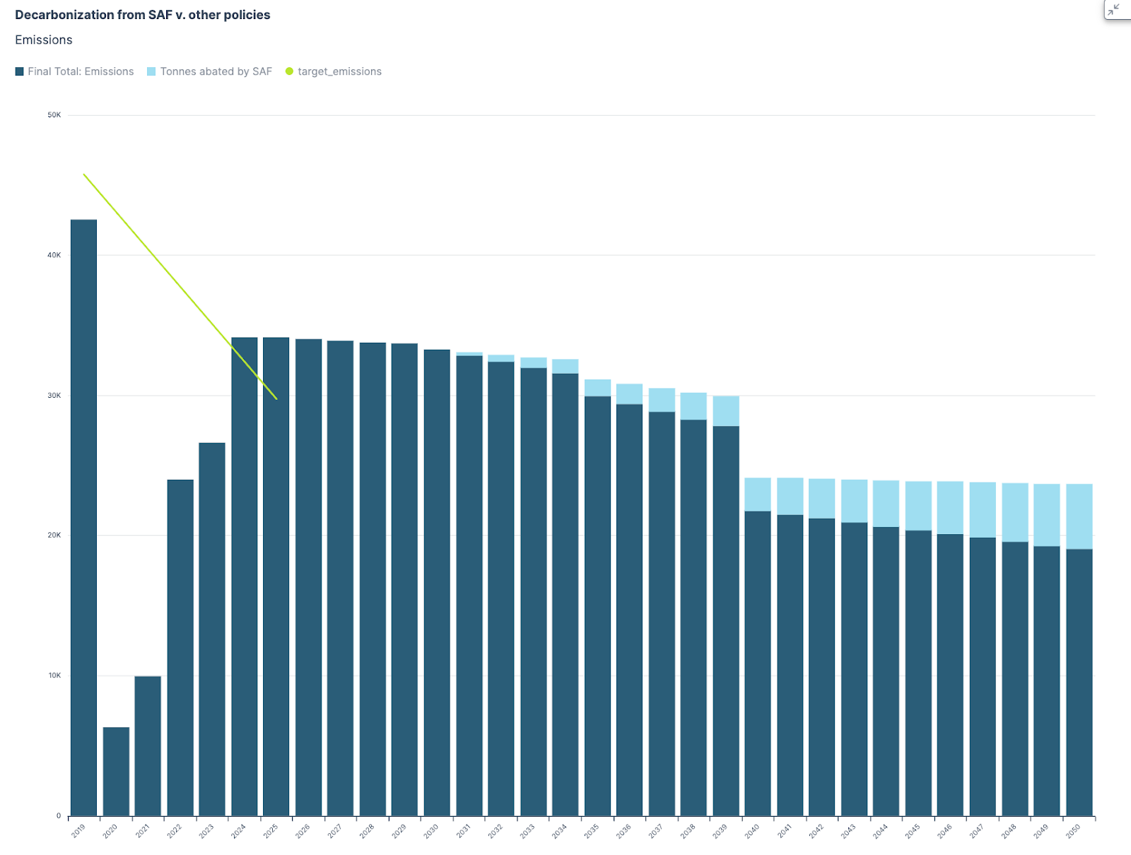 Consequently, in the forecasting model, SAF procurement is treated as a distinct emissions reduction initiative rather than considering scenarios of average SAF usage across all aviation activity.