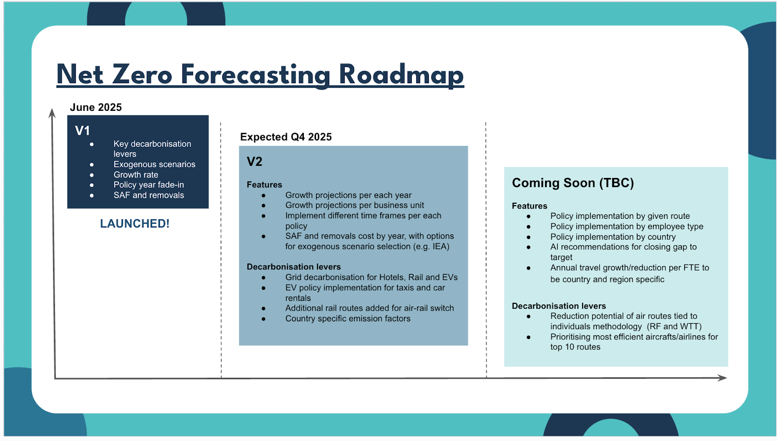 Next version improvement: The forecasting model will be available for multiple scenarios. That is to say that users will be able to create and save multiple versions of the dashboard in order to illustrate different ways of hitting net zero goals.